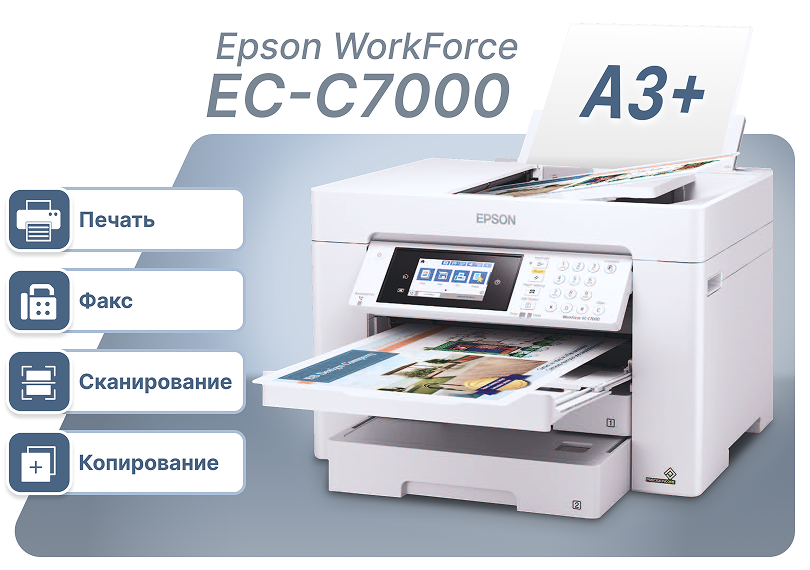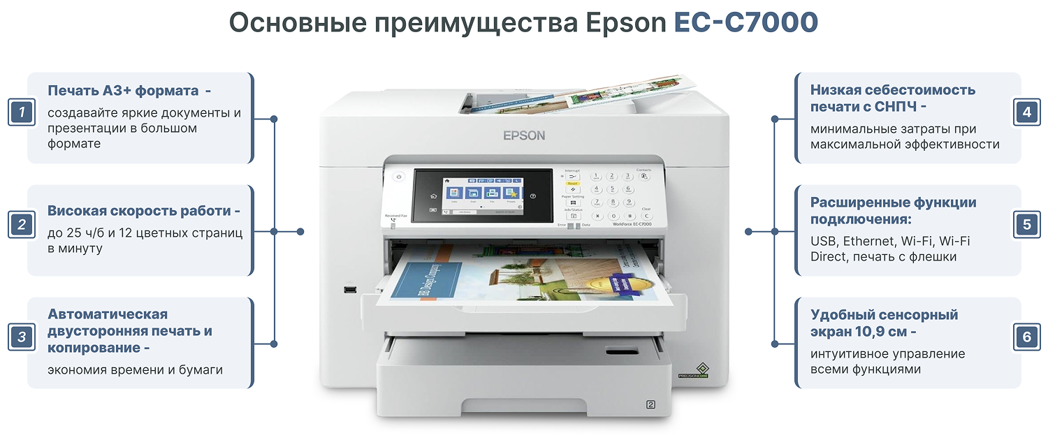 Epson WorkForce EC-C7000 — это универсальное МФУ формата А3, созданное специально для офисов, которым необходимы высокая скорость, качество и надёжность в ежедневной работе. Благодаря широким возможностям печати, сканирования и копирования эта модель станет вашим незаменимым помощником.