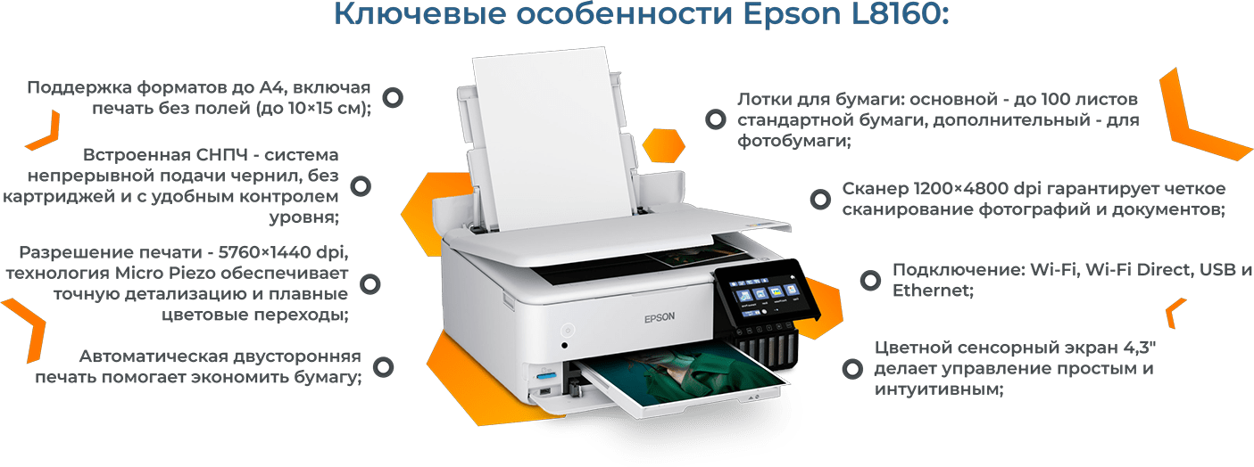 Epson EcoTank L8160 - универсальное устройство «три в одном»: печать, сканирование и копирование. Оно создано для пользователей, которым важна стабильная работа, качество изображений и экономичный расход чернил.