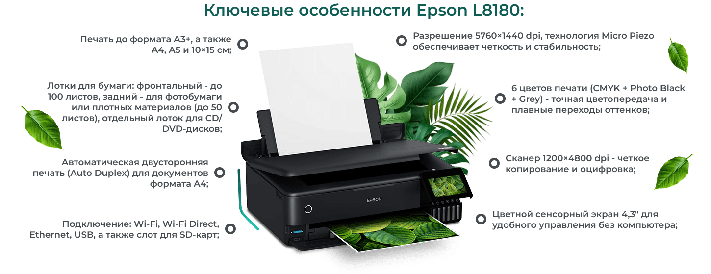 Epson EcoTank L8180 - это продвинутый МФУ 3-в-1 (печать, сканирование, копирование), ориентированный на высококачественную цветную и фотопечать формата A3+.